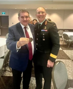 Canadian Armed Forces (CAF) Veteran, servant to the Ukrainian community, and friend of the Canadian Institute of military Veteran Health Research (CIMVHR), Bohdan Cherniawski receiving thank-you and recognition from CAF Surgeon General, Major General Scott Malcolm for support to last nights CIMVHR Forum event: “The Impact of War: Rehabilitation and Medical Surgical Challenges in Ukraine”.
